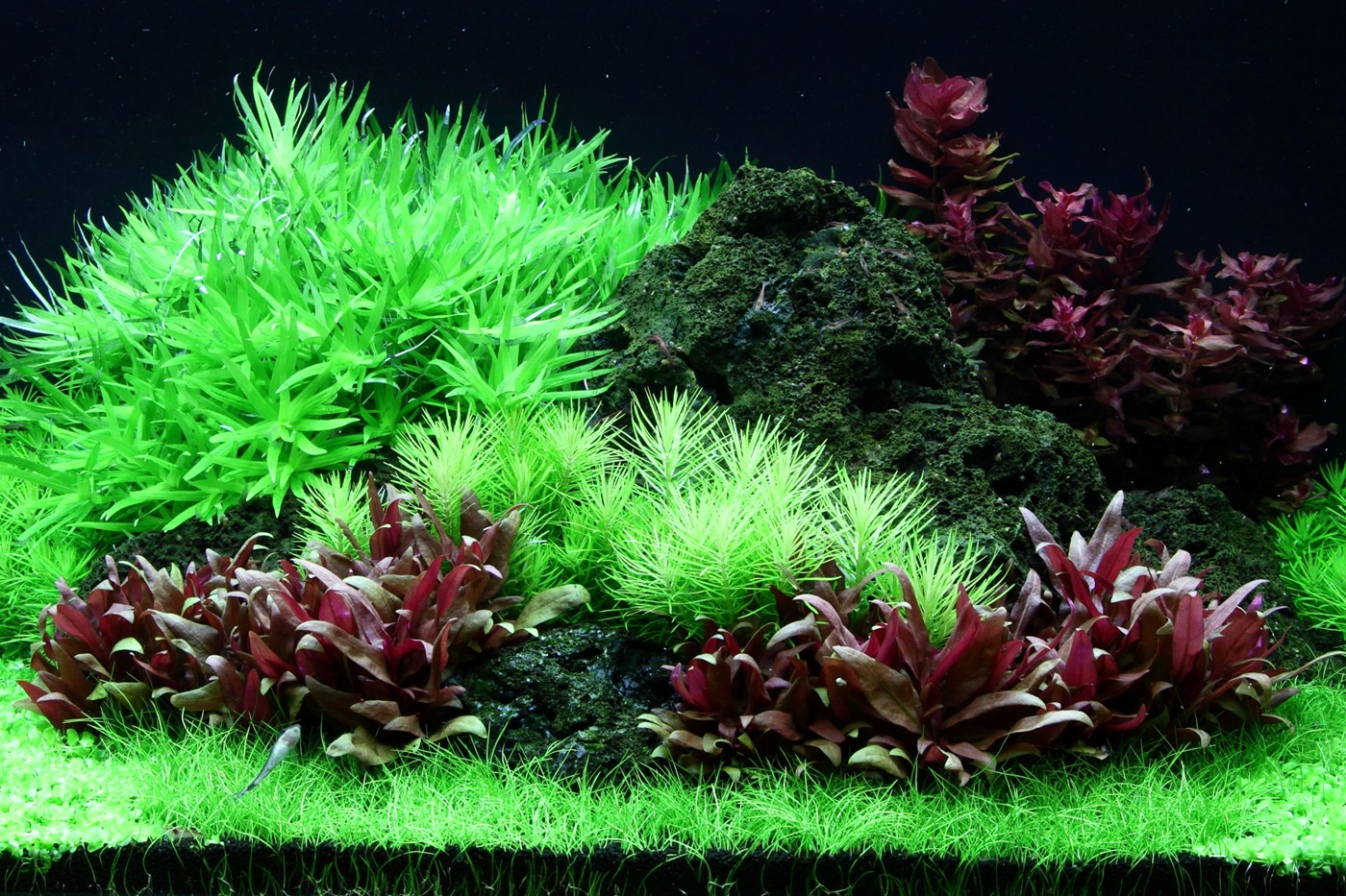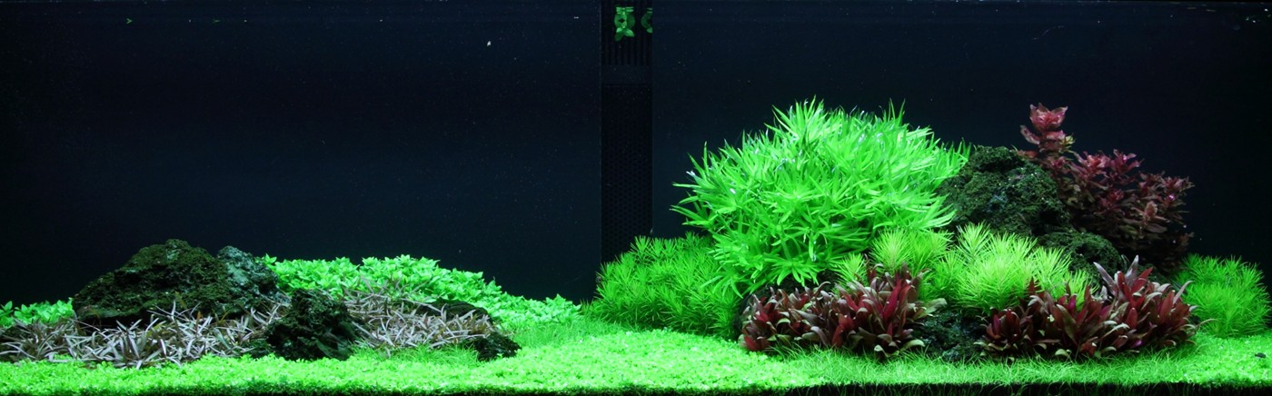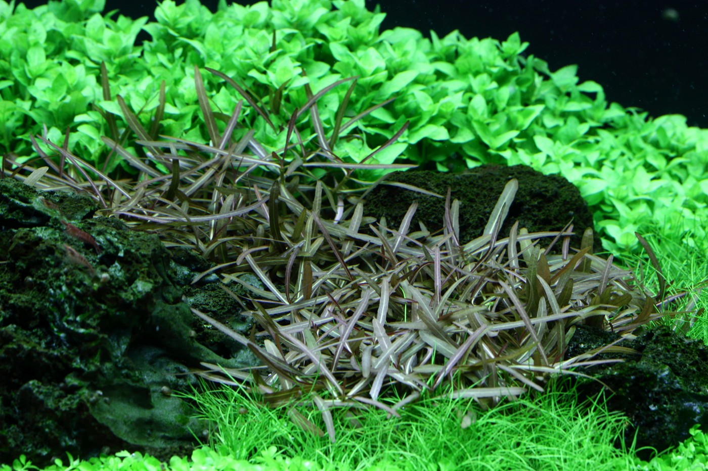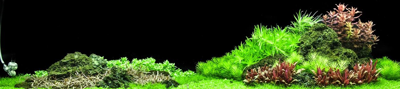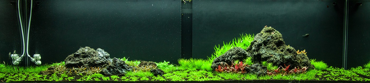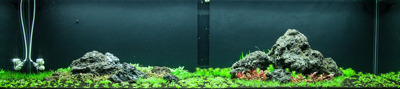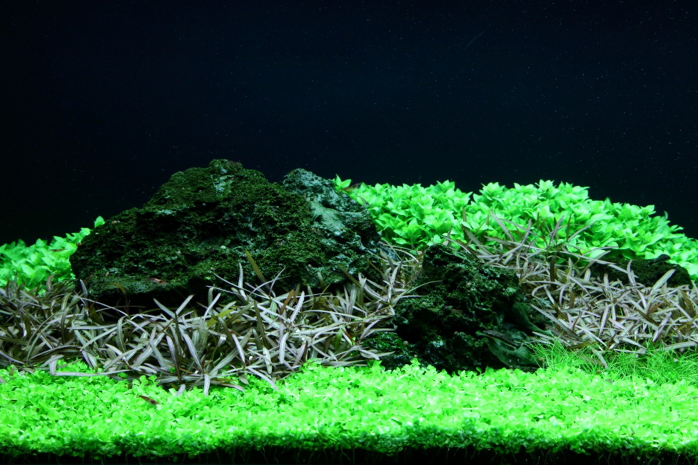 Eight different 1-2-Grow! plants were planted in Aquarium Soil Powder around two groups of grey-black lava rocks. Abundant low and creeping plants create long, horizontal lines that make the aquarium seem peaceful and calm. The stem plants require regular trimming, in order to stay low and compact.