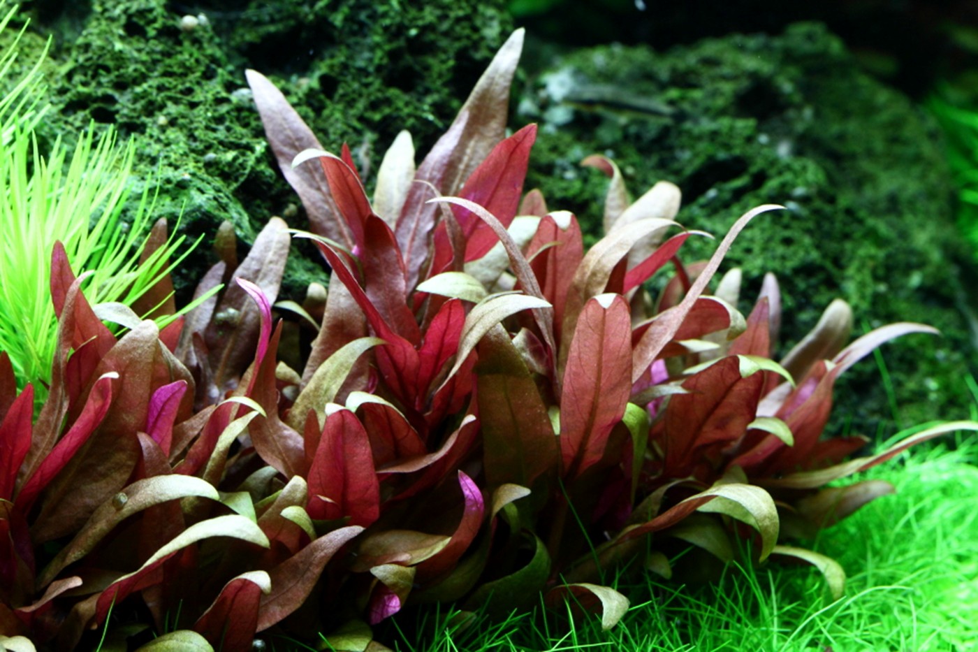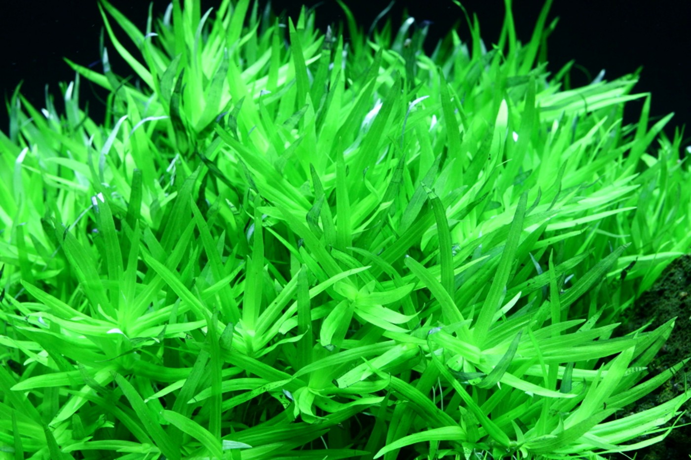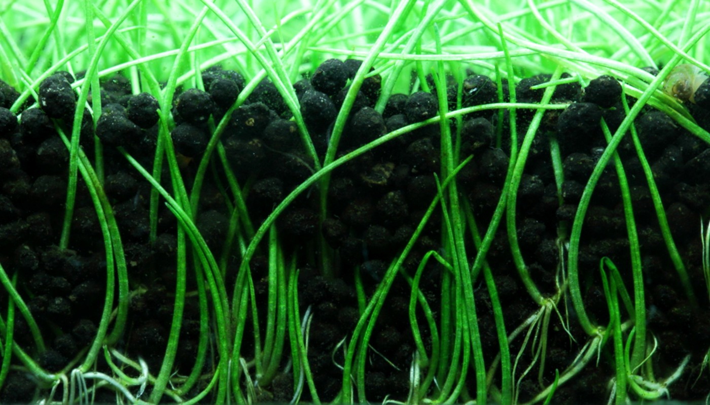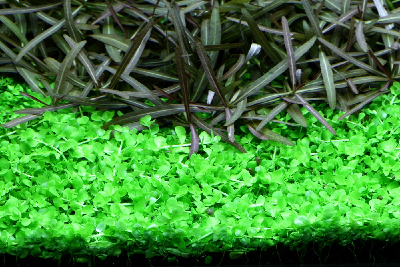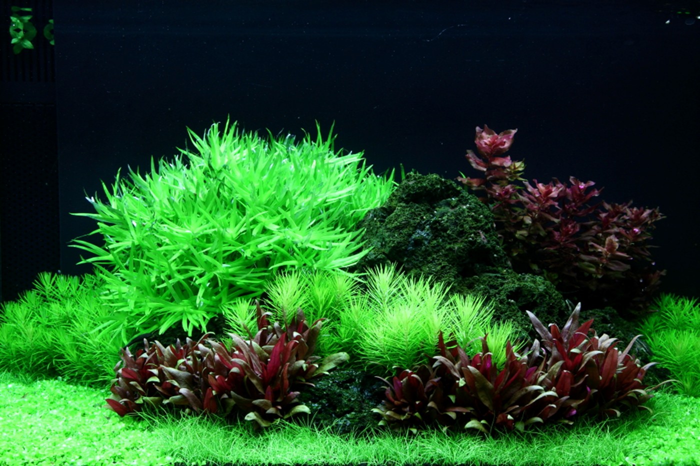 Eight different 1-2-Grow! plants were planted in Aquarium Soil Powder around two groups of grey-black lava rocks. Abundant low and creeping plants create long, horizontal lines that make the aquarium seem peaceful and calm. The stem plants require regular trimming, in order to stay low and compact.