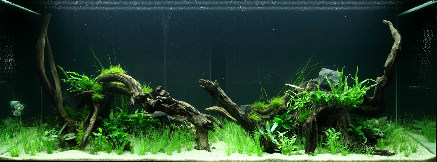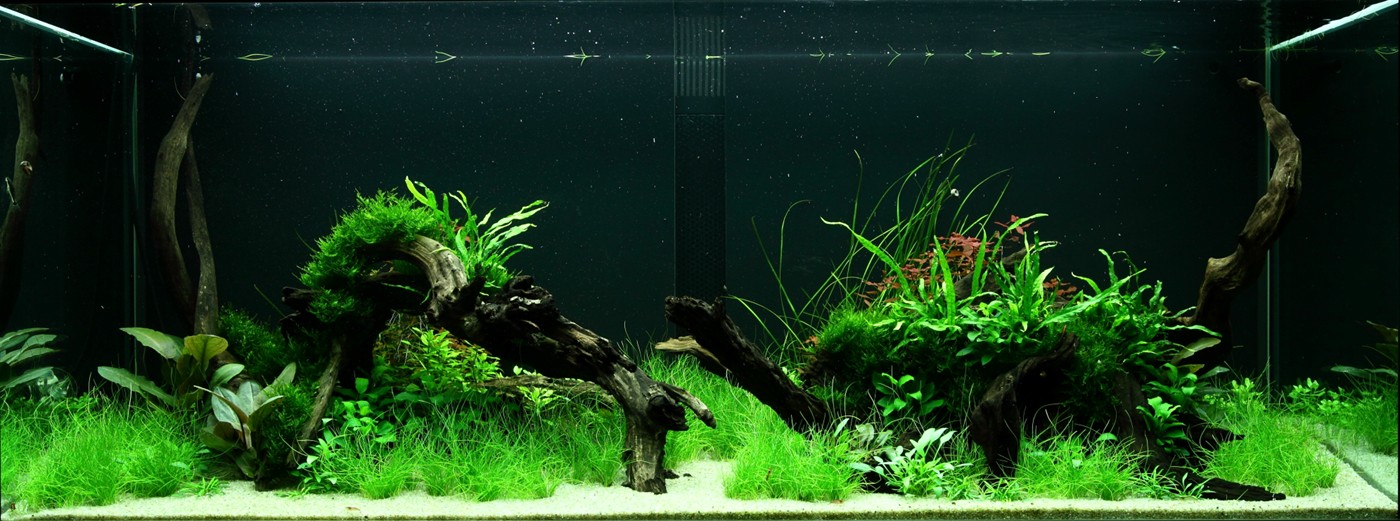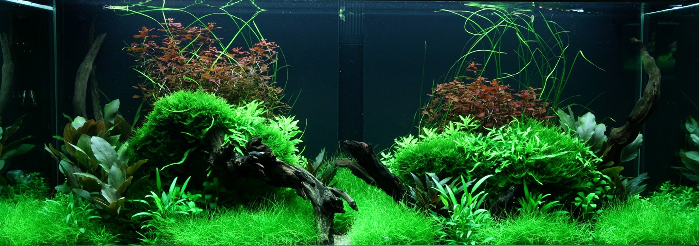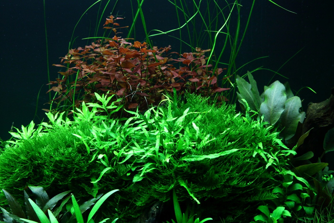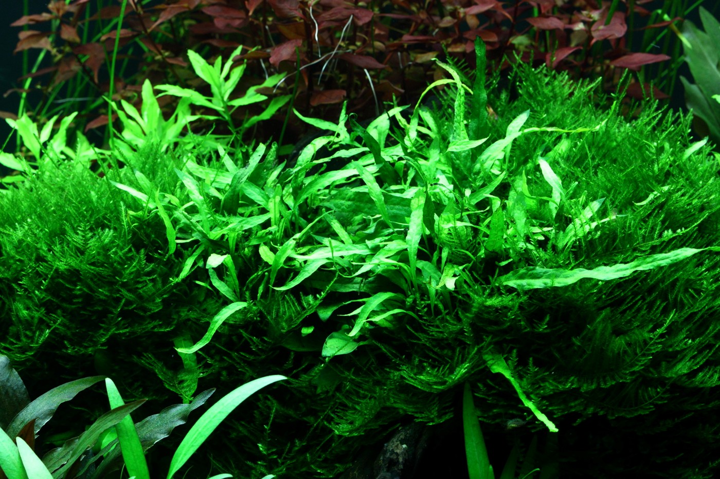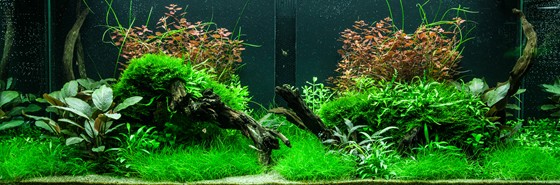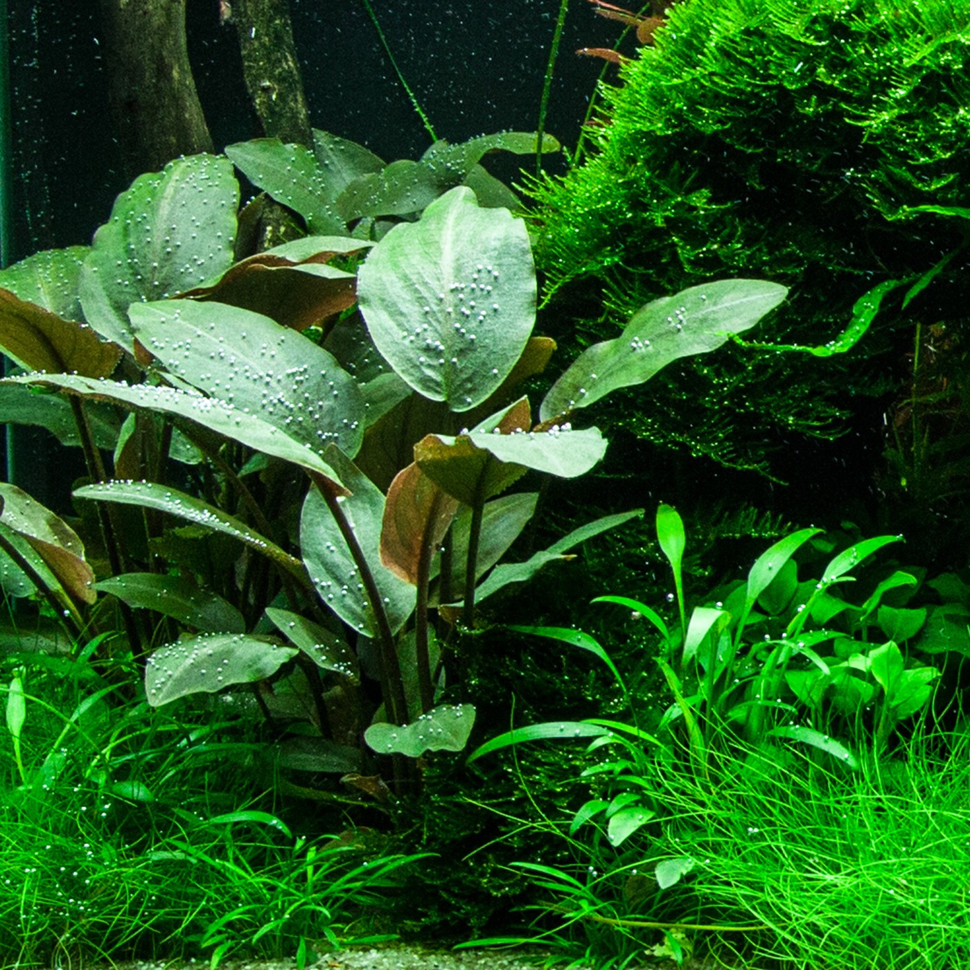 Ferns and mosses fight about the space around the tree roots, while Eleocharis and Cryptocorynes do the same underneath them and Ludwigia and Vallisneria behind them.