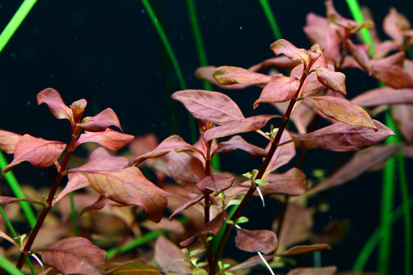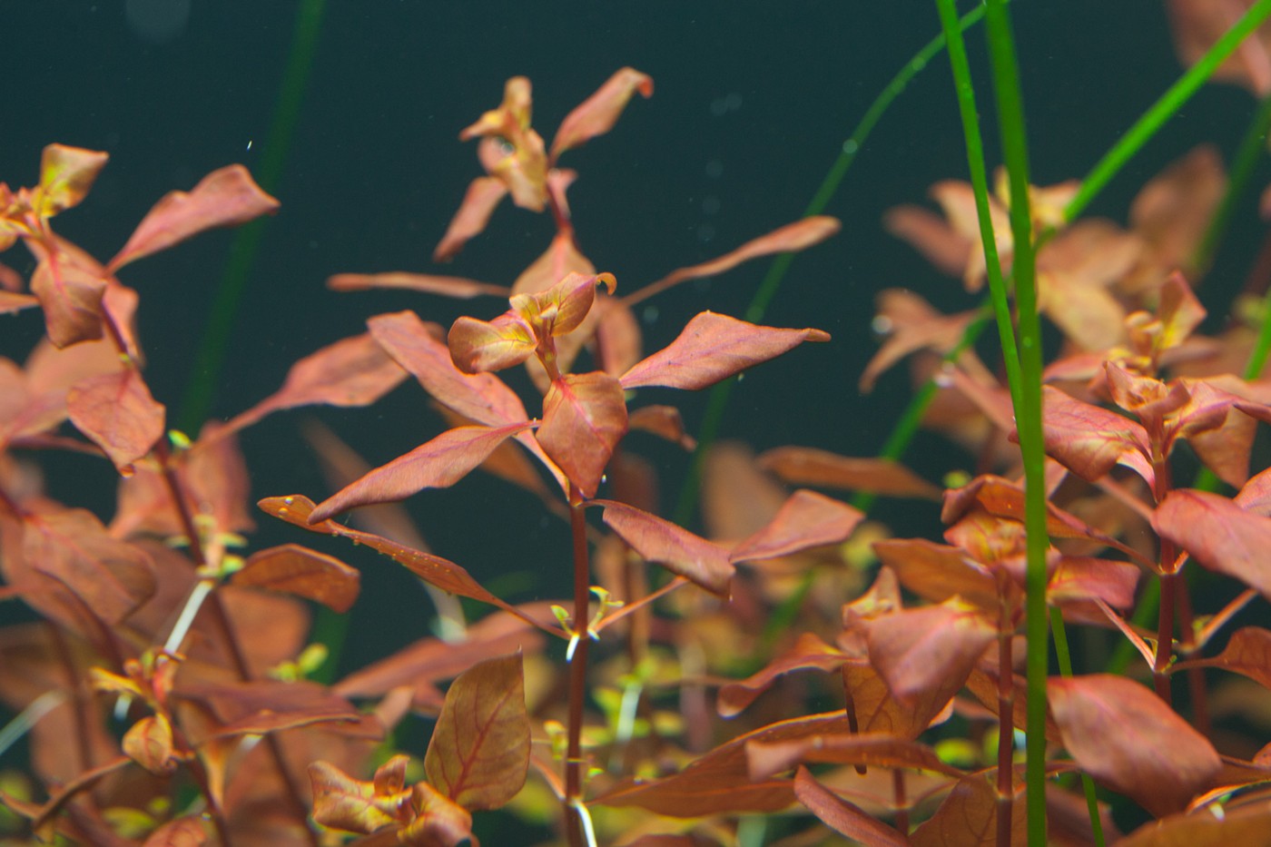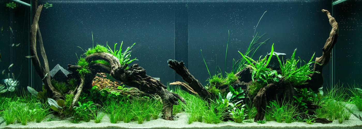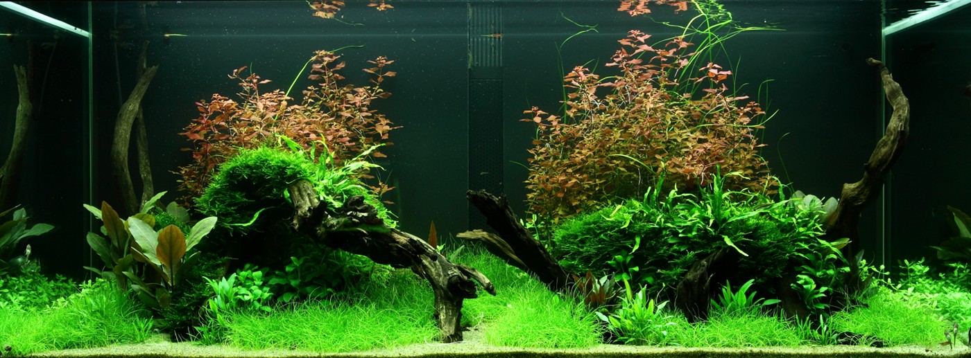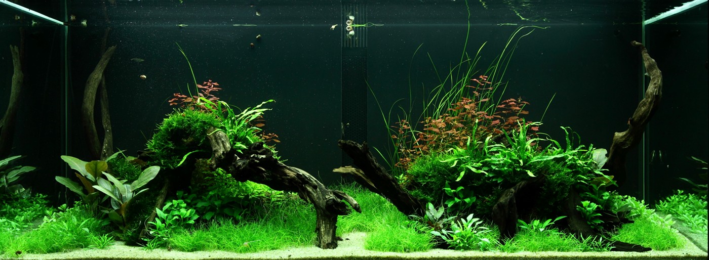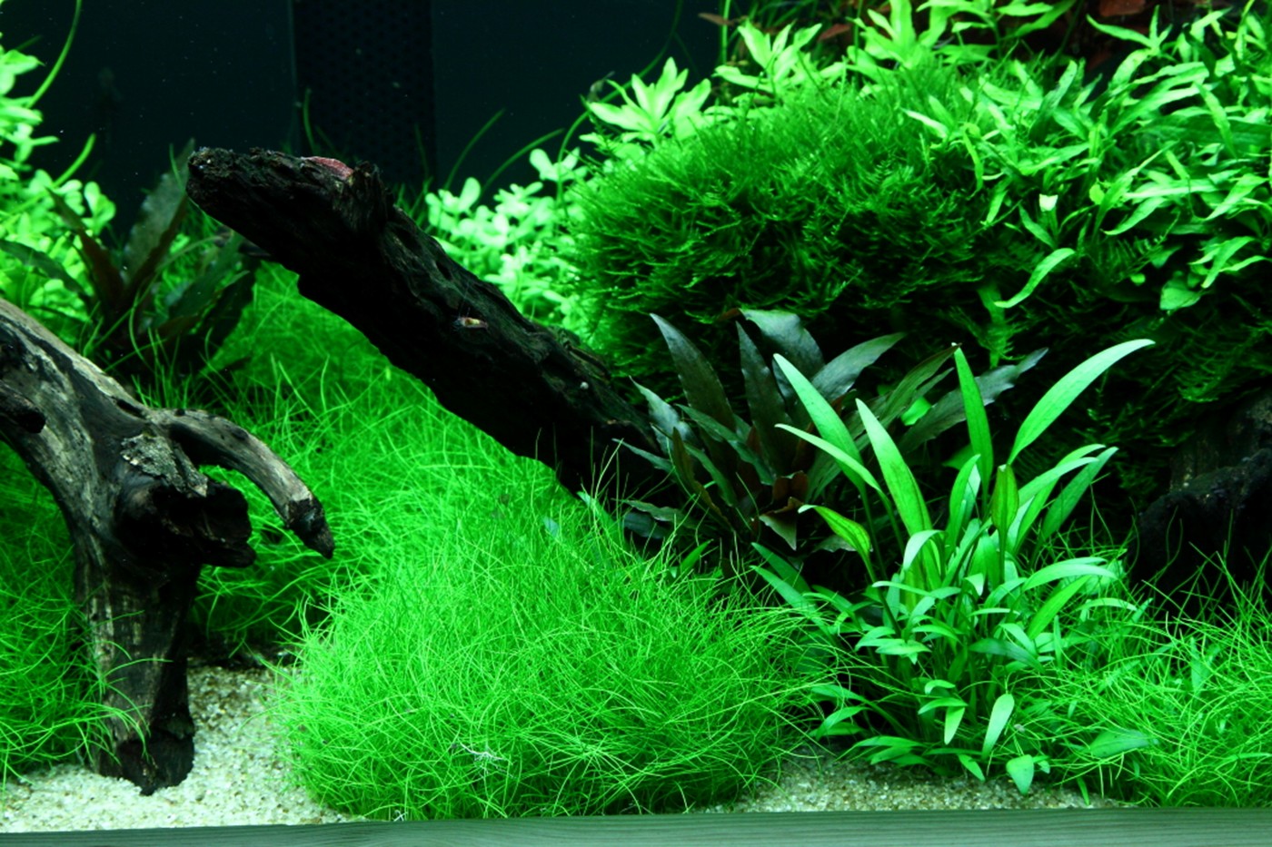 Ferns and mosses fight about the space around the tree roots, while Eleocharis and Cryptocorynes do the same underneath them and Ludwigia and Vallisneria behind them.