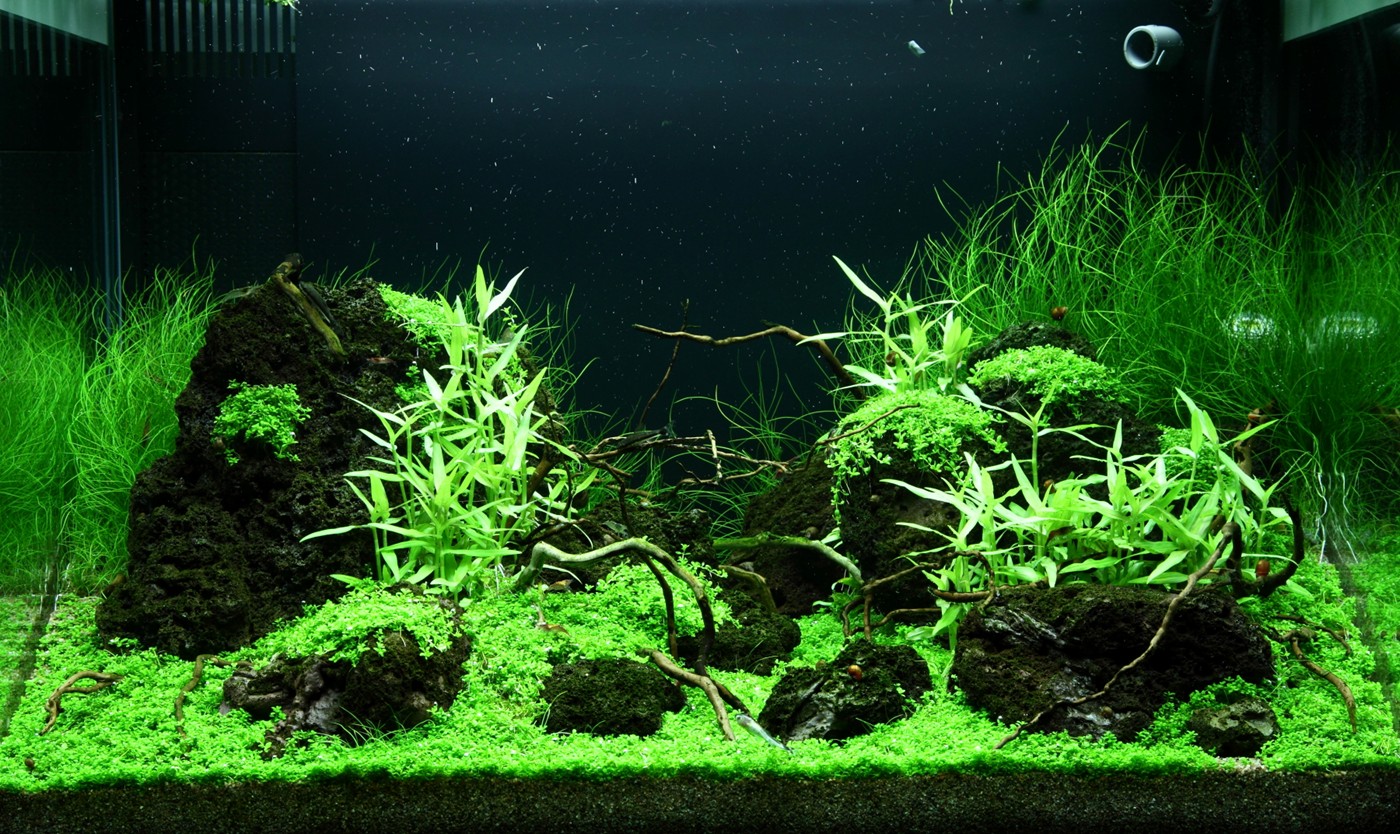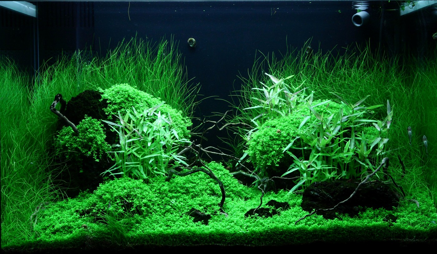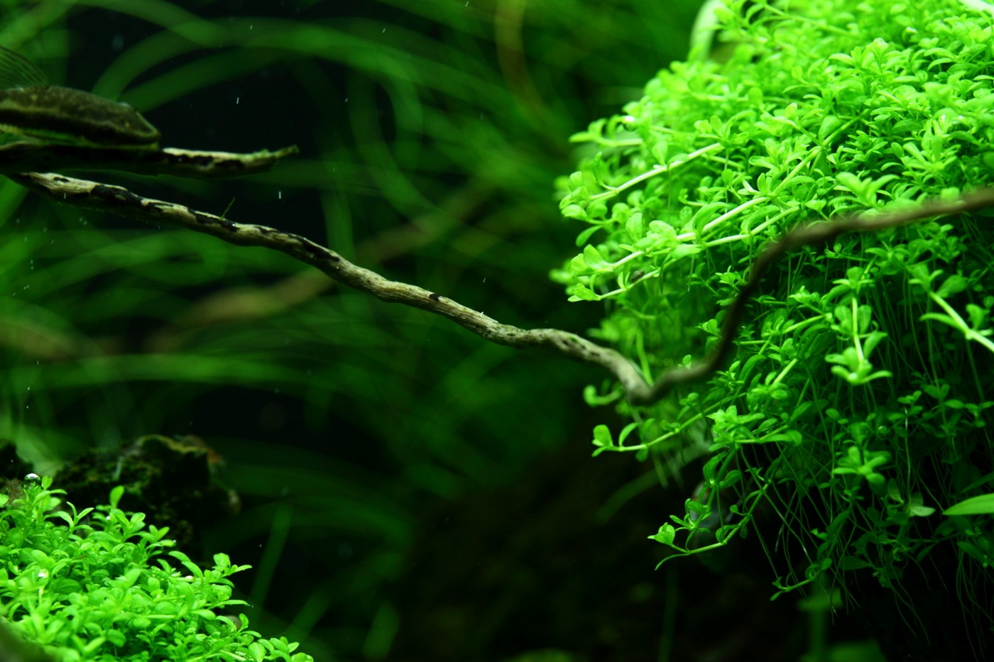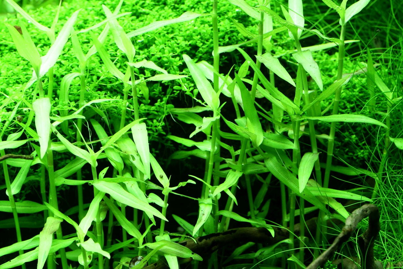 Eleocharis Parvula in the back is floatingly revealed by the lower Eleocharis 'Mini' and incorporated in the front scenery.