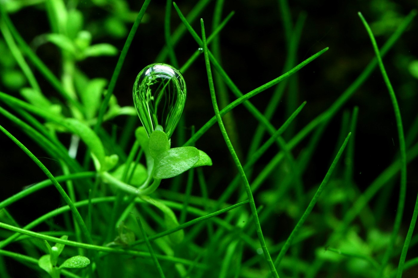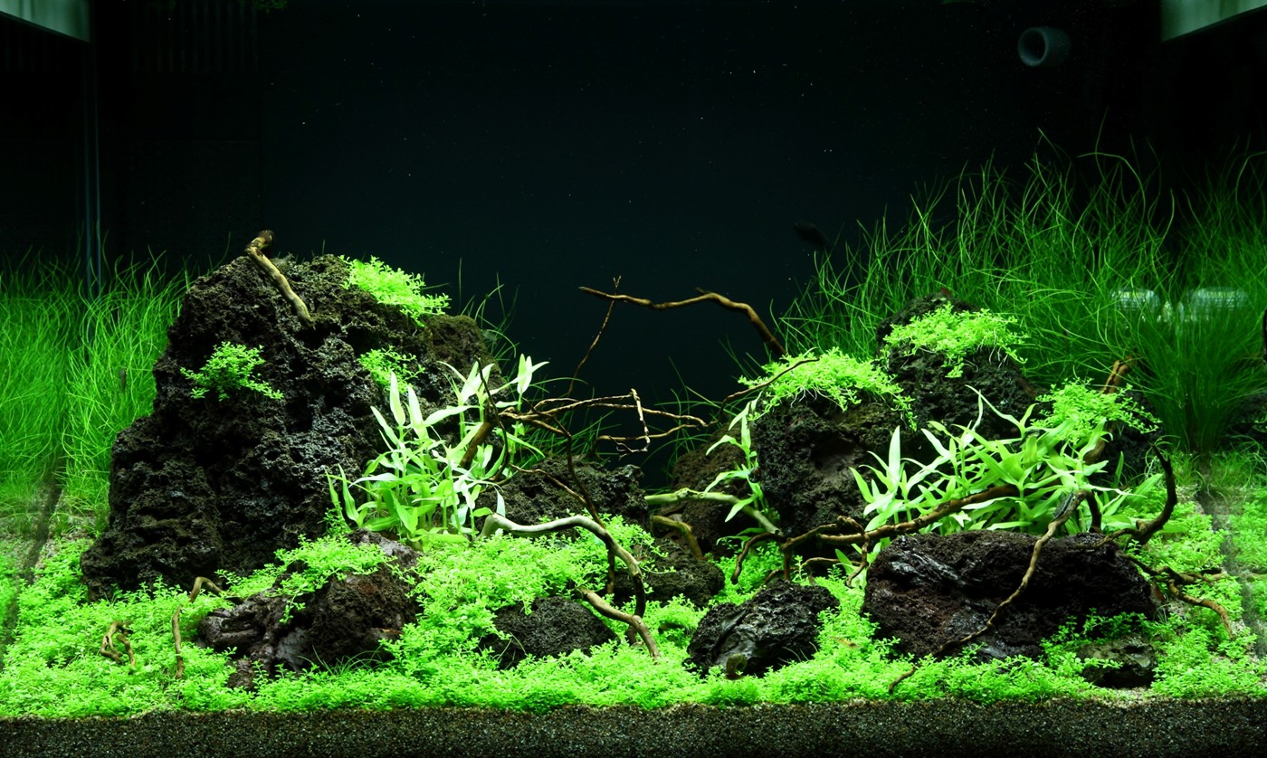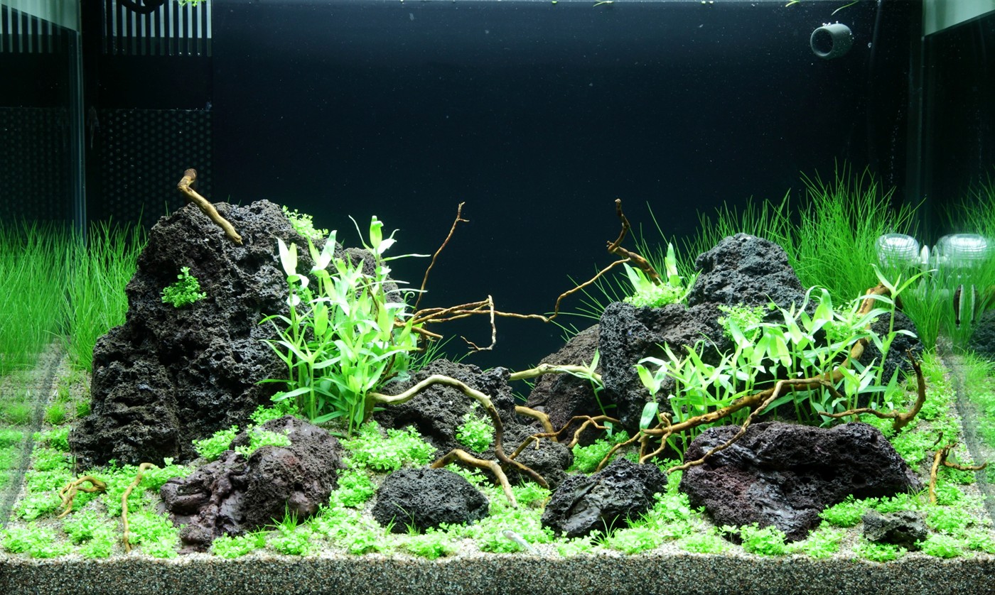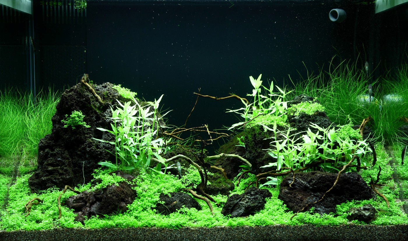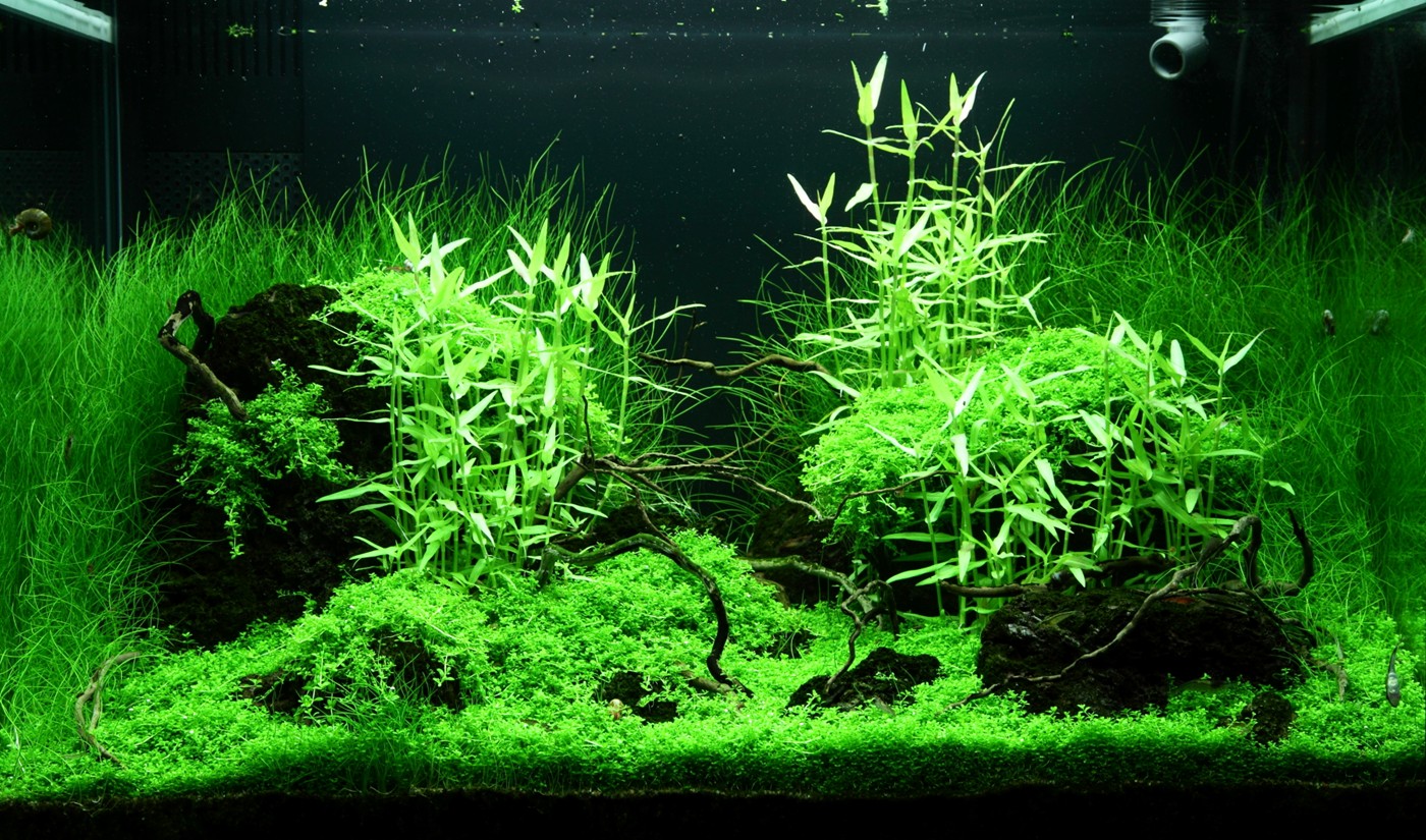 Eleocharis Parvula in the back is floatingly revealed by the lower Eleocharis 'Mini' and incorporated in the front scenery.