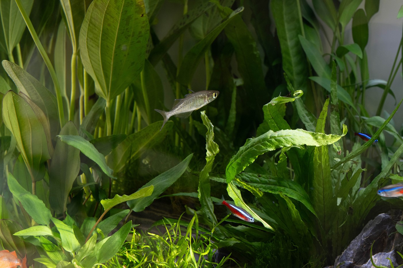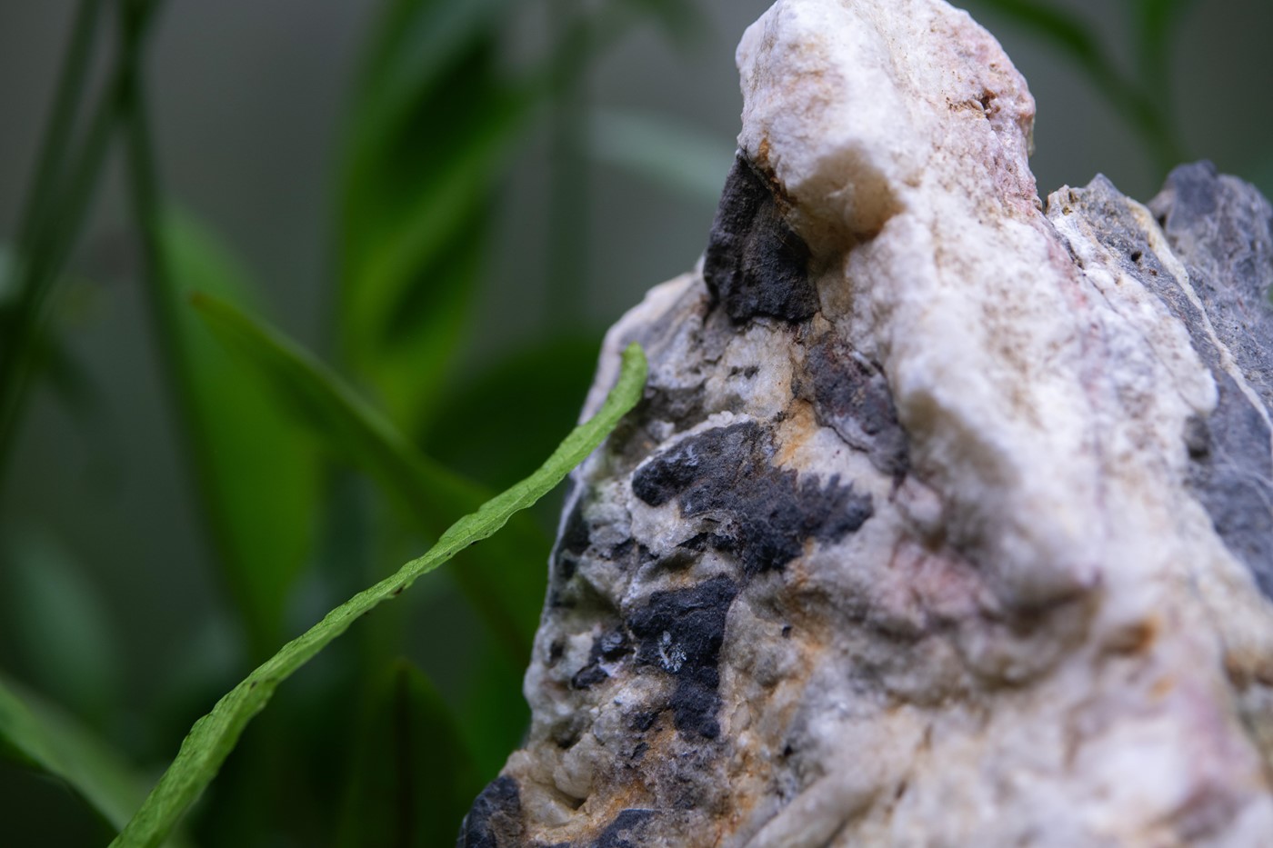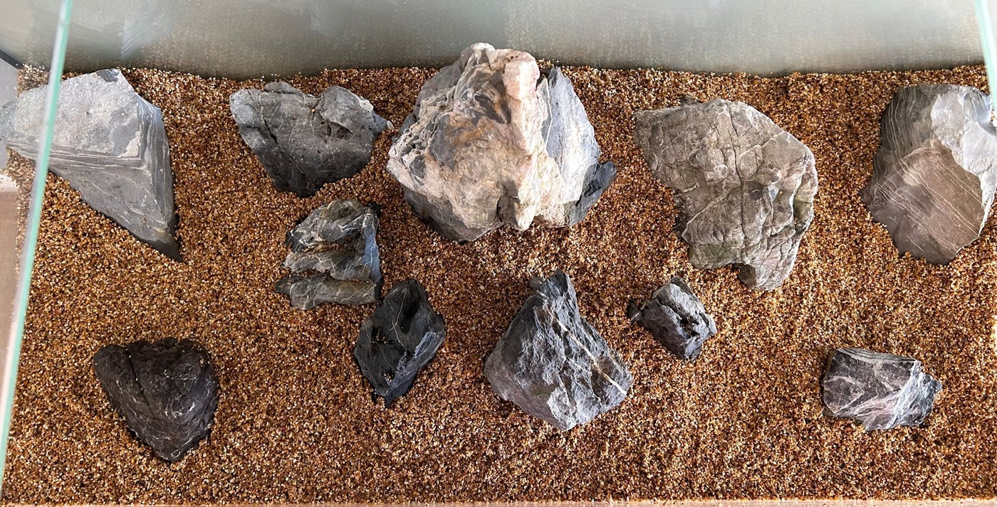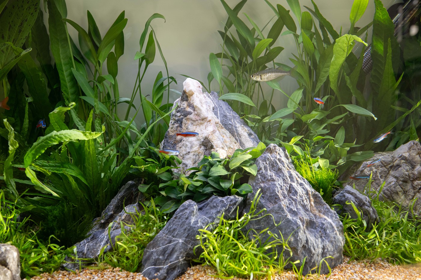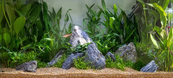 A prominent, triangular shaped mountain “peek” has been positioned in the center of the aquascape (slightly angled to one side) along with Anubias planted along the bottom edge line. This was to create a raised mountain look within a jungle style surrounding. Six smaller grey mountain rocks surround the mountain peak, with groups of Helanthium planted in-between with plenty of space in the foreground to grow into. Four more rocks were used on the outer sections, then in the background and side spaces we used a variety of Cryptocorynes, Echinodorus & Microsorum.